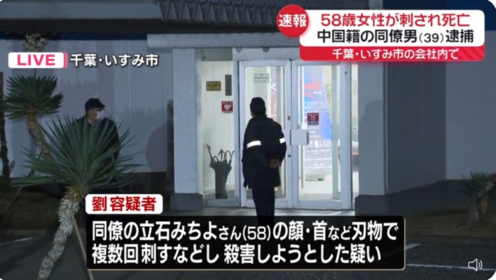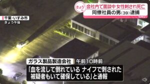 2025年12月5日午前、千葉県いすみ市のガラス製品製造会社で、同僚の中国籍男性社員が58歳の女性社員を刃物で刺し、殺害しようとしたとして現行犯逮捕されました。
